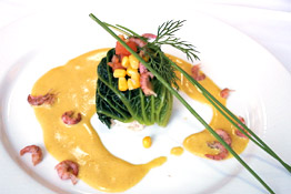 Emenceer de venkelknol en de uien zeer fijn Stoof deze aan in een ingeboterde pan (geen moes, een knapperige mengeling) Ondertussen fileren we de wijting en snijden deze in grove stukken, pocheren deze even, en als ze gaar zijn, voegen we deze bij de groentenmengeling. We nemen de pan van het vuur en voegen nu de (reeds gare) maïs toe. In een aparte kookpan laten we de savooibladeren in zijn geheel zachtkoken. We nemen deze uit het kookvocht, draaien hier de groenten-vismengeling in en binden het vast met 2 bieslookstengels, deze rolletjes houden we warm in de steamer, of in een sautoir met een zilverpapiertje errond. De saus : We laten de mosterd met de visfumet inkoken tot de helft, hierbij voegen we de room, opnieuw inkoken tot de helft, de wijn toevoegen, inkoken tot de helft, de saffraan, gehakt venkelloof en klontjes koude boter toevoegen. We bekomen een geel-oranje saus, met contrasterend groen van het zacht anijsgetinte venkelkruid.
