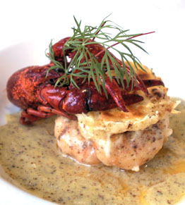 Op het bord dresseren met een lepeltje saus. Bovenop de saus het scampipotje 3 gepelde rivierkreeftjes met kop rondom het bord Gratineren onder de salamander en daarna afwerken met een takje dille.